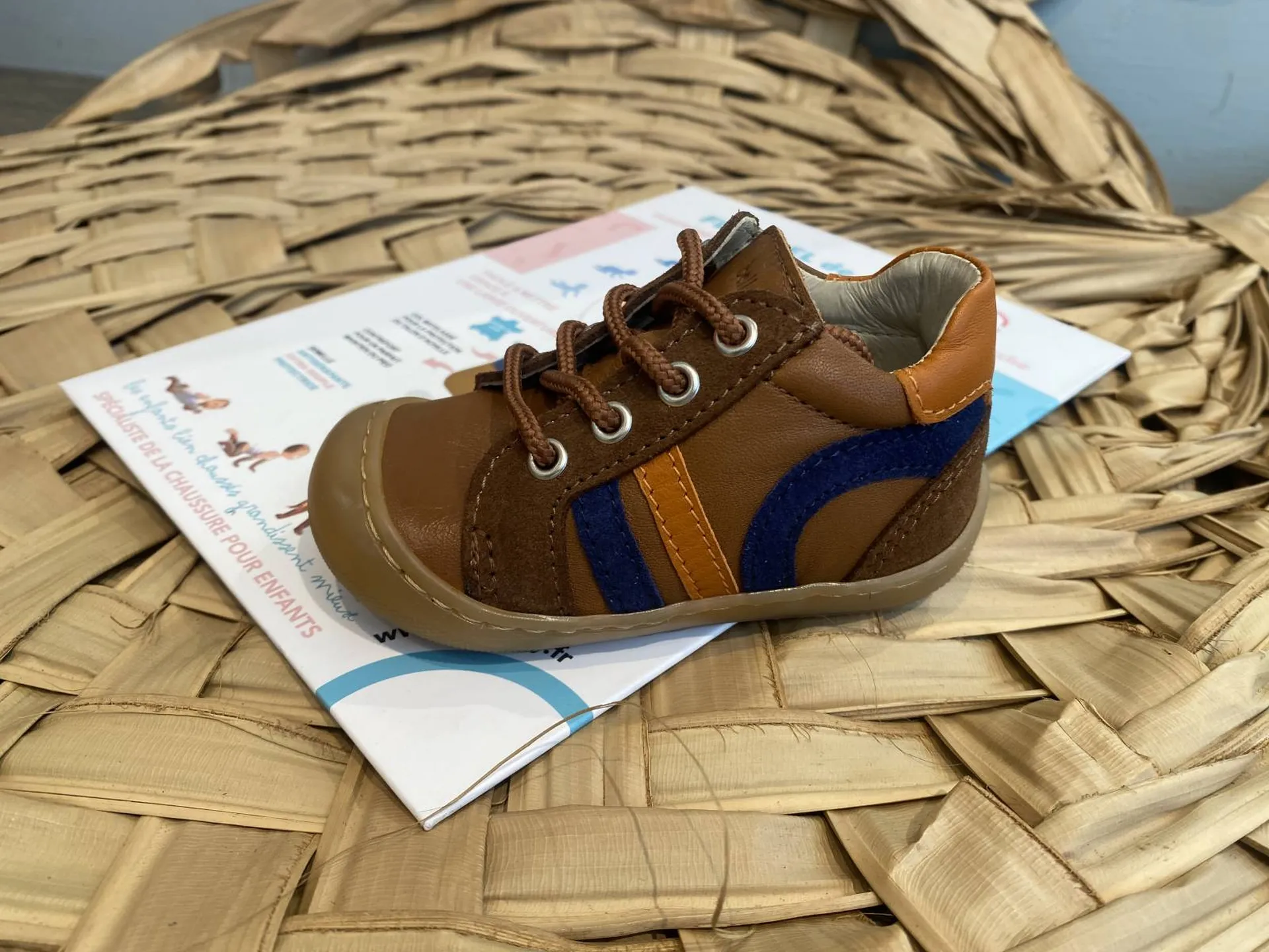 Chaussure en cuir pour les premiers pas de votre petit bonhomme , un confort grâce au cuir souple, des semelles souples et des matériaux qui respecteront la peau fragile de vos tout petits.