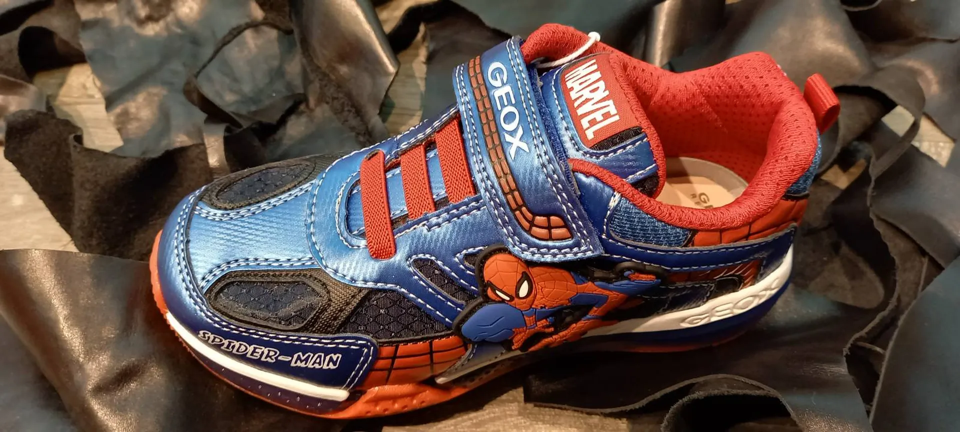 Sneakers pour garçon amorties et respirantes au look sportif et dynamique, dotées de lumières intégrées dans la semelle extérieure. Des couleurs emblématiques et des supers héros pour la gamme GEOX SPORT .